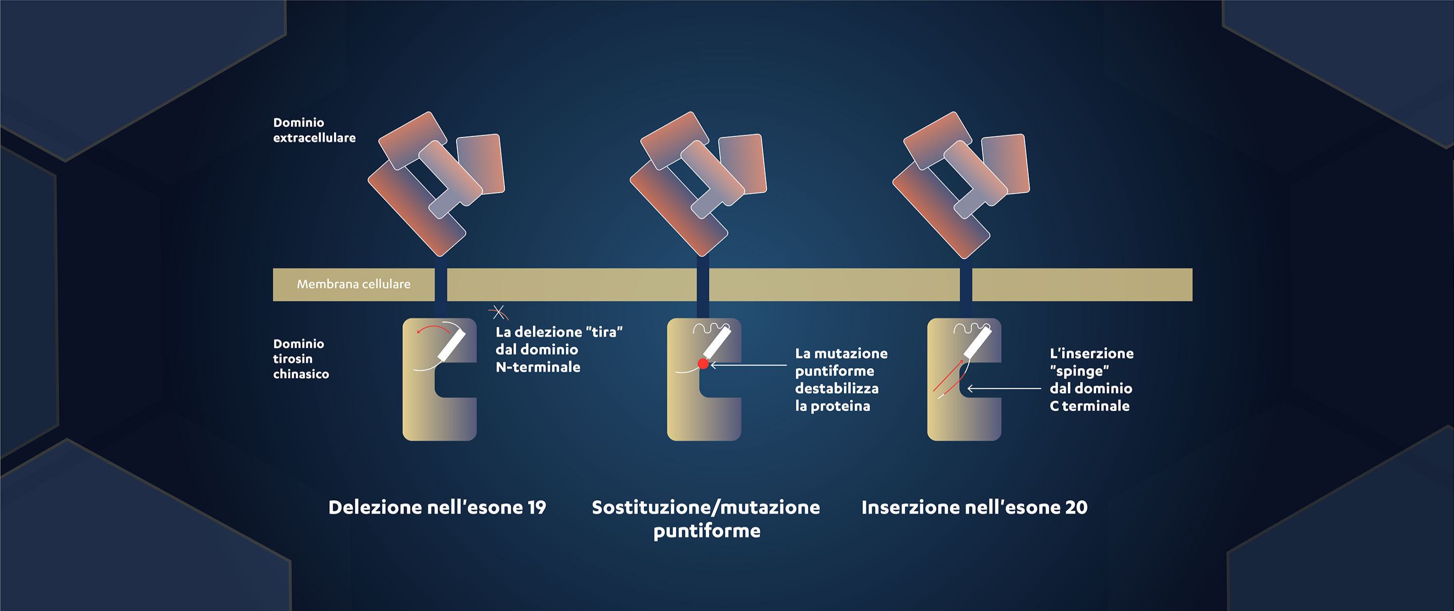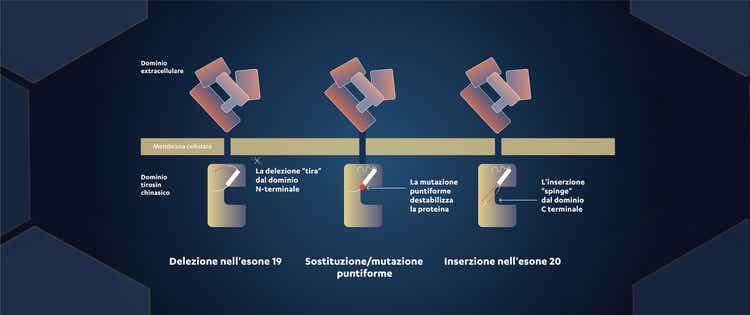 Figura 3. Delezioli, sostituzioni/mutazioni puntiformi e inserzioni attivano EGFR anche in assenza di un ligando, modificando la conformazione del